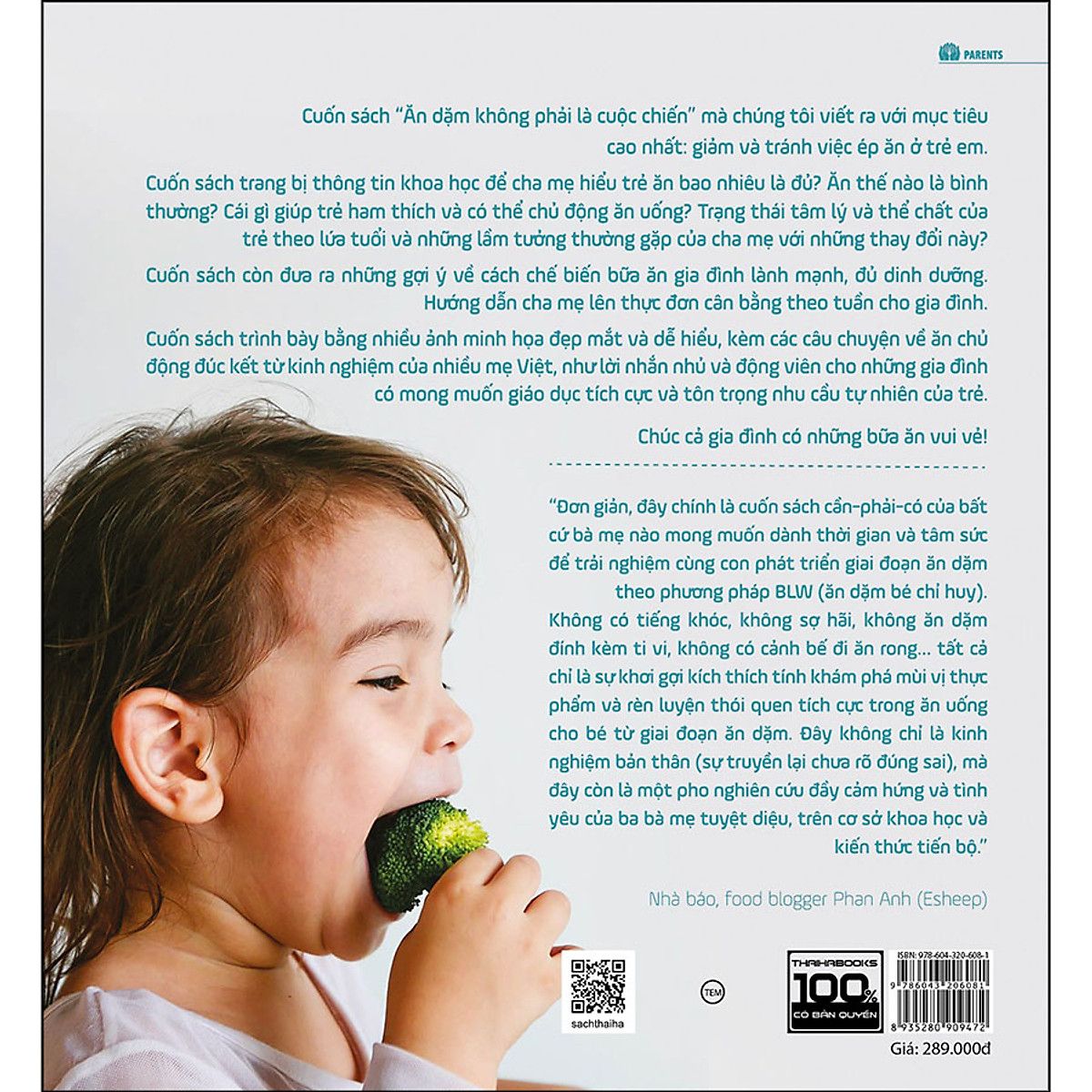 Cuốn sách trang bị các thông tin khoa học để cha mẹ hiểu trẻ ăn bao nhiêu là đủ? Thế nào là bình thường? và cái gì sẽ giúp ham thích và có thể có thể chủ động tự ăn uống? Những trạng thái tâm lý và thể chất của trẻ em theo mỗi lứa tuổi và những hiểu nhầm thường gặp của cha mẹ với những thay đổi này? Cuốn sách đưa ra những gợi ý về cách chế biến bữa ăn gia đình lành mạnh, đủ dinh dưỡng. Hướng dẫn cha mẹ lên thực đơn cân bằng theo tuần cho gia đình, đồng thời kèm theo các thực đơn mẫu.