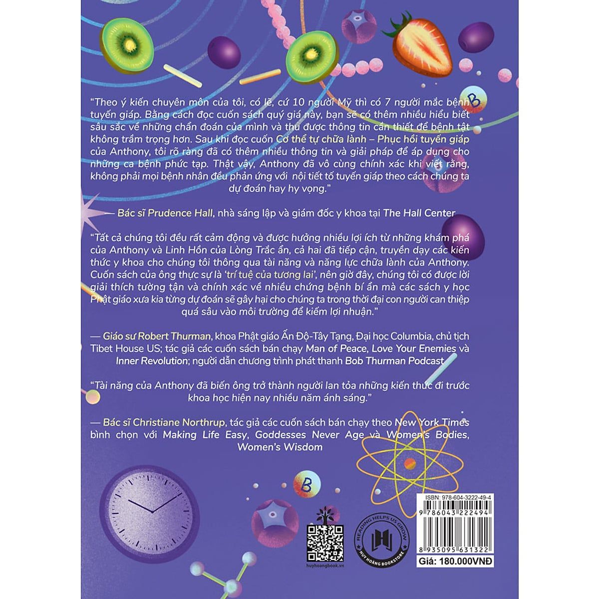“Theo ý kiến chuyên môn của tôi, có lẽ, cứ 10 người Mỹ thì có 7 người mắc bệnh tuyến giáp. Bằng cách đọc cuốn sách quý giá này, bạn sẽ có thêm nhiều hiểu biết sâu sắc về những chẩn đoán của mình và thu được thông tin cần thiết để bệnh tật không trầm trọng hơn. Sau khi đọc cuốn Cơ thể tự chữa lành – Phục hồi tuyến giáp của Anthony, tôi rõ ràng đã có thêm nhiều thông tin và giải pháp để áp dụng cho những ca bệnh phức tạp. Thật vậy, Anthony đã vô cùng chính xác khi viết rằng, không phải mọi bệnh nhân đều phản ứng với nội tiết tố tuyến giáp theo cách chúng ta dự đoán hay hy vọng.”